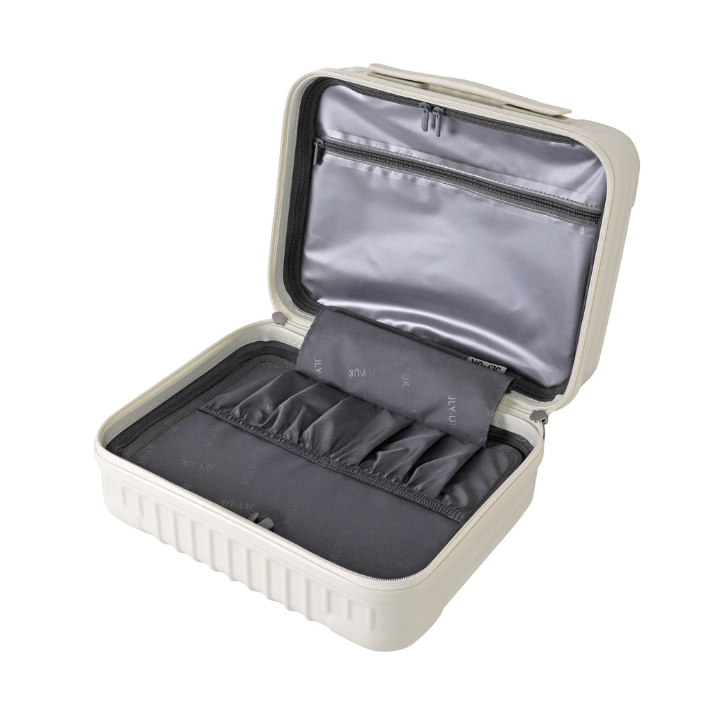 Inside, you’ll find smart compartments with elastic bands and mesh pockets to keep your cosmetics and essentials neatly organised. The water-resistant lining protects against spills, while the rear strap lets you securely attach the case to your suitcase handle.