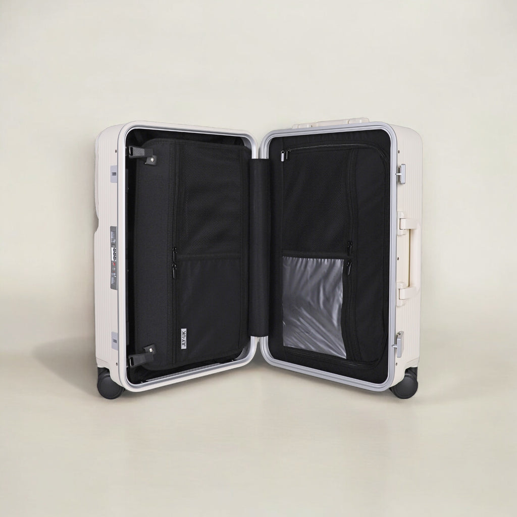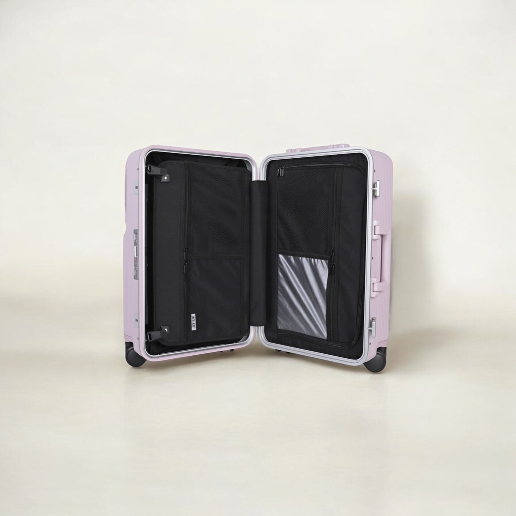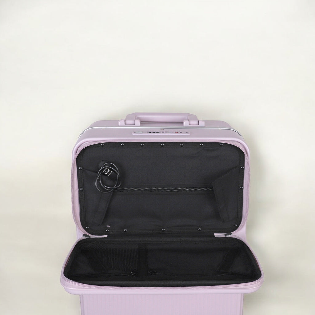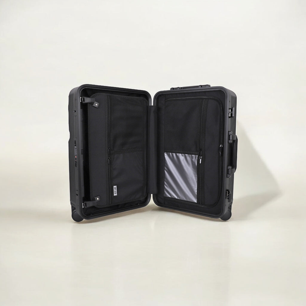 JLY Rövaan is a sophisticated, style-forward collection crafted for the modern traveler seeking intuitive design and elevated convenience. Blending contemporary aesthetics with cutting edge functionality, each case is equipped with thoughtful essentials including a built-in USB charging port, an integrated cup holder, and ultra smooth, ultra quiet precision engineered ball bearing spinner wheels for effortless maneuverability. A dedicated wet zone pocket keeps damp items separate from dry. Constructed from premium Costrovo™ 100% polycarbonate and lined with soft-touch peach skin fabric, the Rövaan delivers both durability and tactile luxury. Security is seamlessly integrated with a slide-button TSA clasp lock and a reinforced aluminum frame, offering peace of mind on every journey. Designed for a seamless packing experience and effortless mobility, Rövaan is more than luggage. It is travel, refined.
