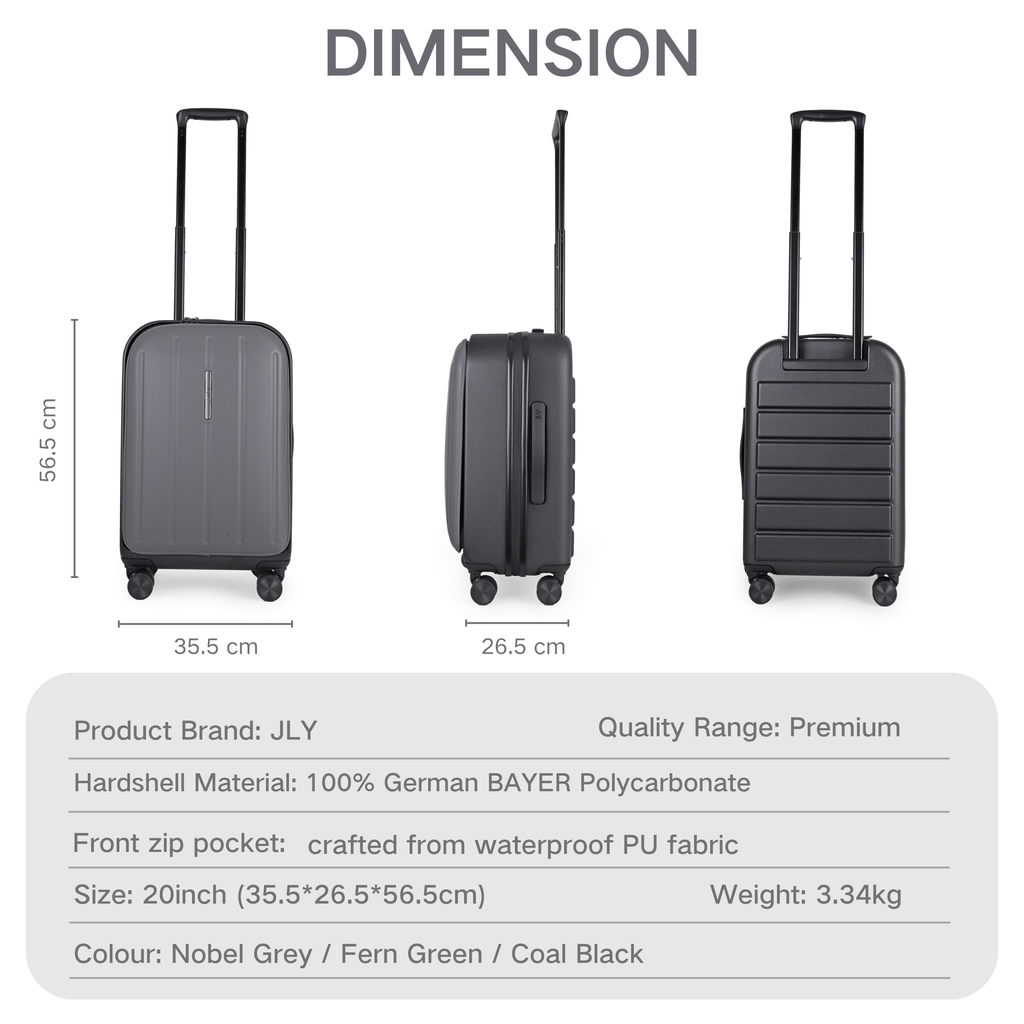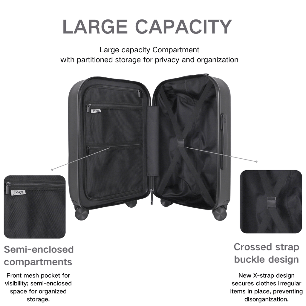 Experience the ultimate in travel luxury with the JLY Cabin Trolley, a meticulously crafted carry-on that combines style, durability, and functionality. Constructed from premium polycarbonate, this suitcase ensures your belongings remain secure and protected throughout your journey. The sleek, waterproof design features a bi-fold opening, revealing two spacious compartments equipped with elastic crossbands and mesh closures for superior organisation. Effortless packing and unpacking are made possible with a full-silhouette zip, while the large front pocket, crafted from waterproof PU fabric, provides quick access to your essentials, including passports, laptops up to 15”, and tablets. Enhanced security comes from the integrated TSA-approved lock, and the comfort telescopic handle along with four multi-directional wheels ensures smooth and easy navigation through airports and city streets. The JLY Cabin Trolley is finished with a front webbing compression strap and a smart trolley sleeve for stacking multiple bags. Elevate your travel experience with the JLY Cabin Trolley—where elegance meets efficiency.