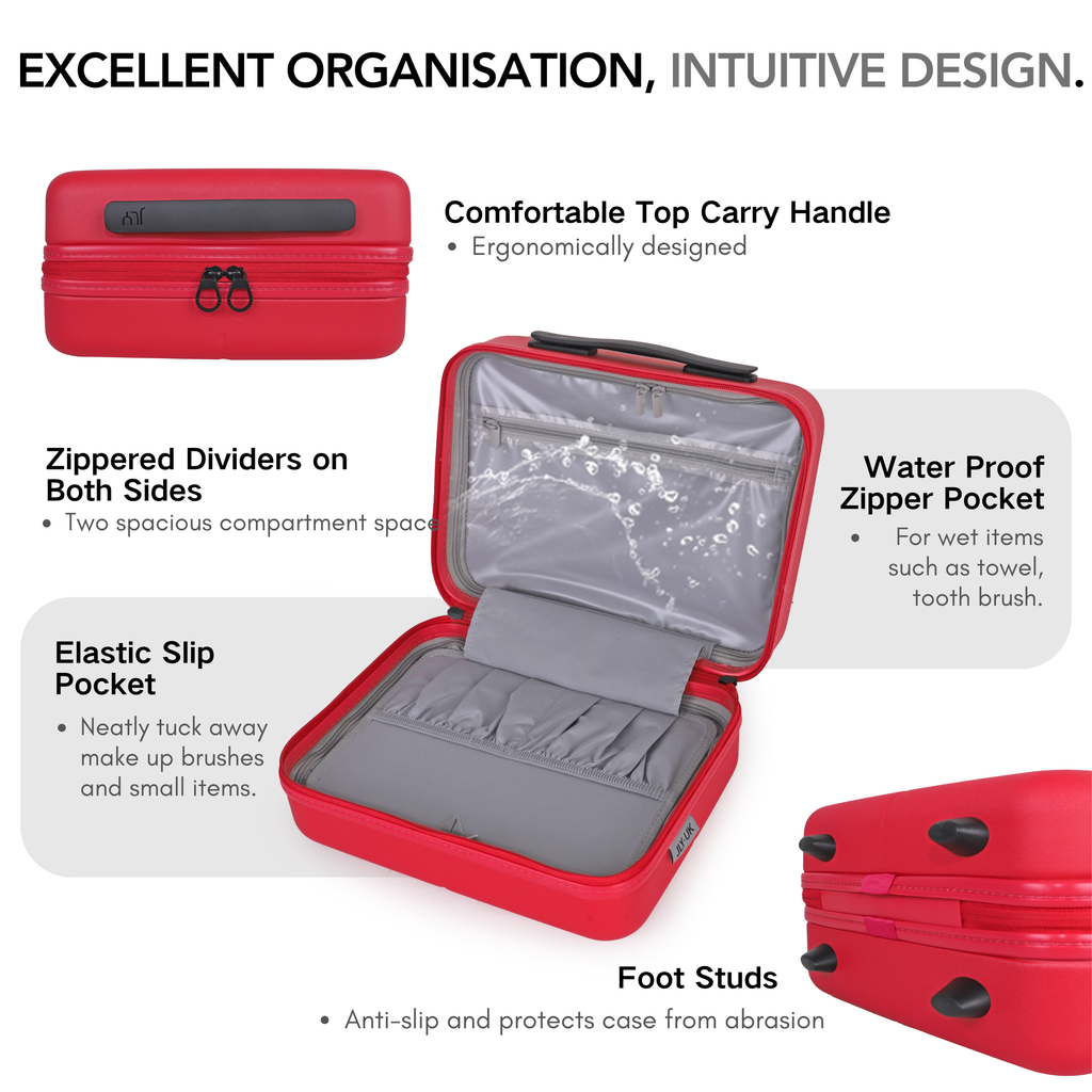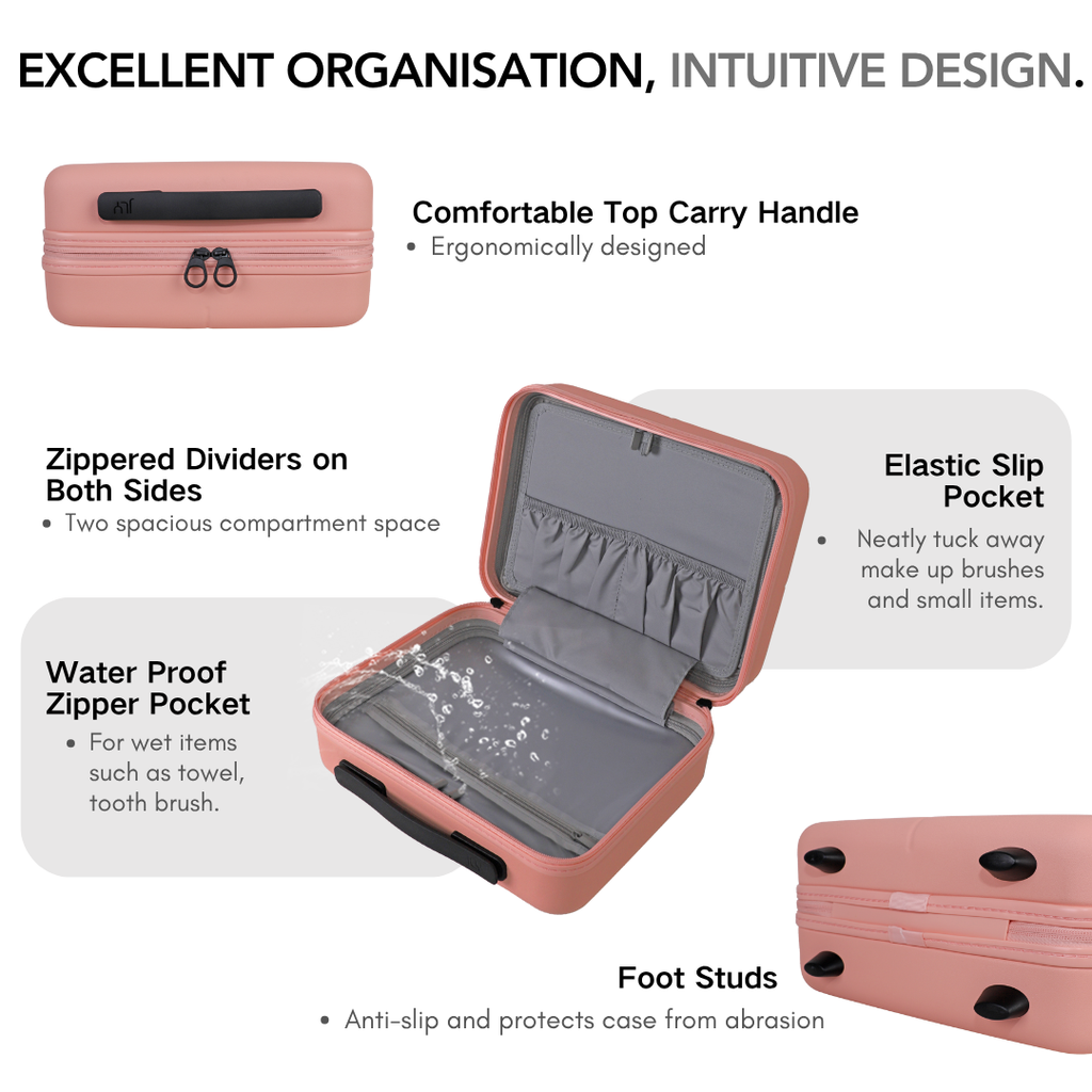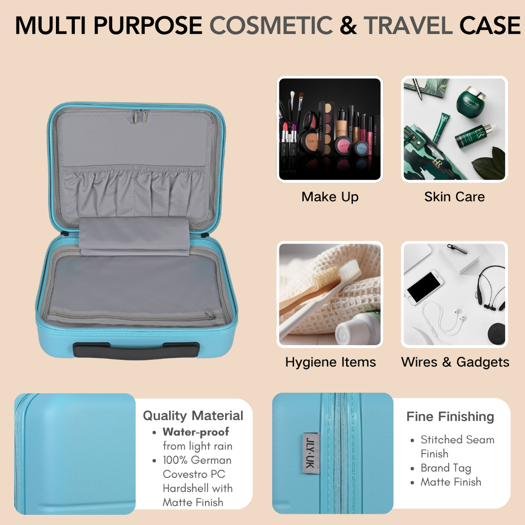 Dive into the vibrant world of travel with the JLY UK Timeless collection. Elevate your journey with this exquisite cosmetic case that enhances your experience of organised travel. Crafted from 100% German Makrolon® Polycarbonate with a beautiful matte finish, it ensures journeys are as stylish as they are enduring. Inside, you’ll find premium quality lining and exceptional organization, including wet/dry separation for effortless packing. With ample space for makeup, accessories, and sanitary products, everything stays neatly in place, while allowing quick access to liquids for security checks. Lightweight and designed for a truly hassle-free travel experience, carry it by hand or attach it to your suitcase. Make every trip a sophisticated adventure with the JLY UK Timeless collection.