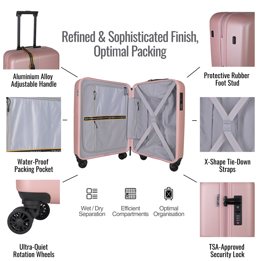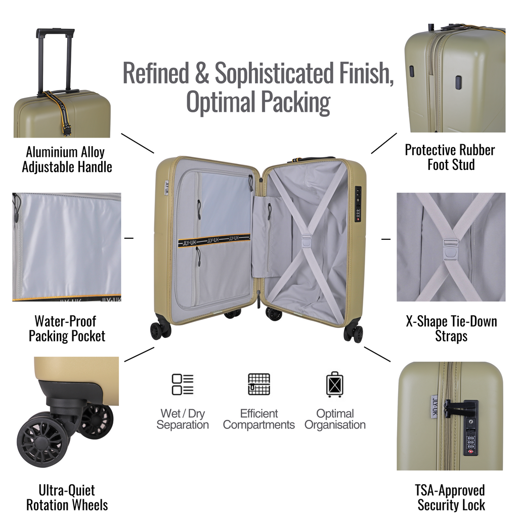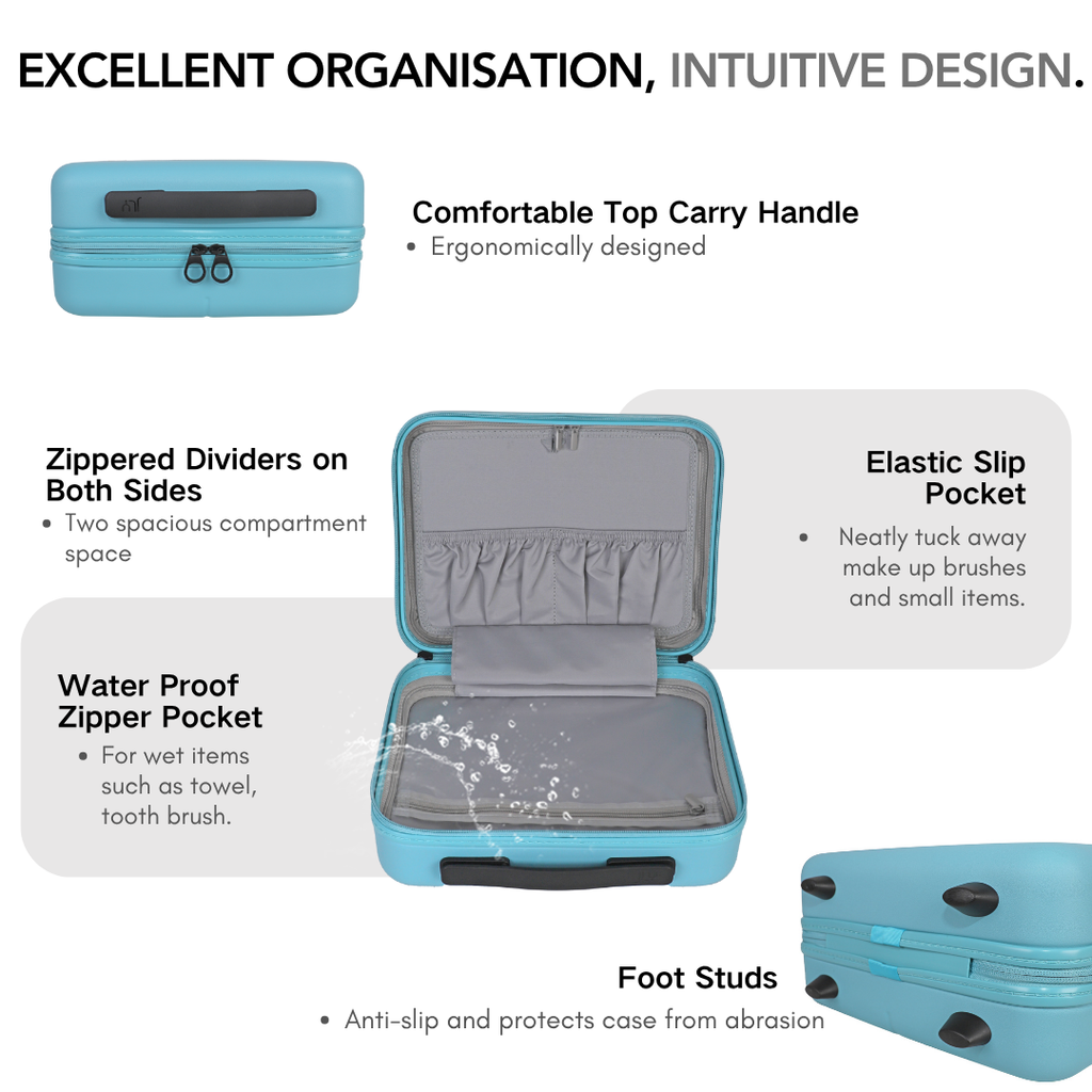 Dive into the vibrant world of travel with the JLY UK Timeless collection. Elevate your journey with this exquisite cosmetic case that enhances your experience of organised travel. Crafted from 100% German Makrolon® Polycarbonate with a beautiful matte finish, it ensures journeys are as stylish as they are enduring. Inside, you’ll find premium quality lining and exceptional organization, including wet/dry separation for effortless packing. With ample space for makeup, accessories, and sanitary products, everything stays neatly in place, while allowing quick access to liquids for security checks. Lightweight and designed for a truly hassle-free travel experience, carry it by hand or attach it to your suitcase. Make every trip a sophisticated adventure with the JLY UK Timeless collection.