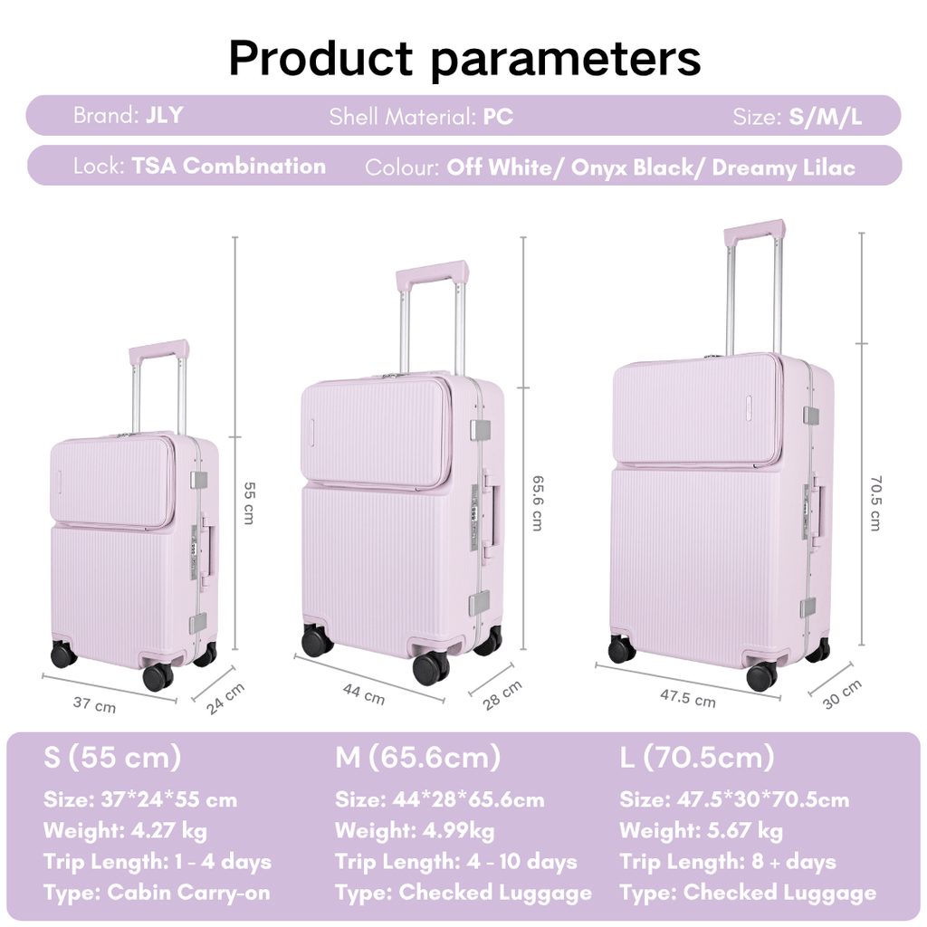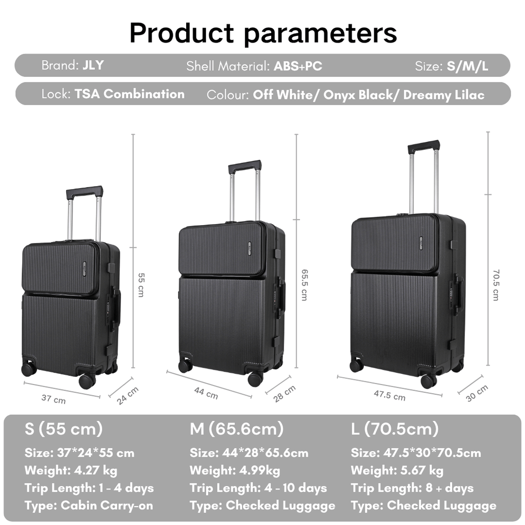 • Small (Carry-On): 36 × 23 × 55 cm (including wheels), Weight: 3.2 kg – Ideal for 1–5 day trips